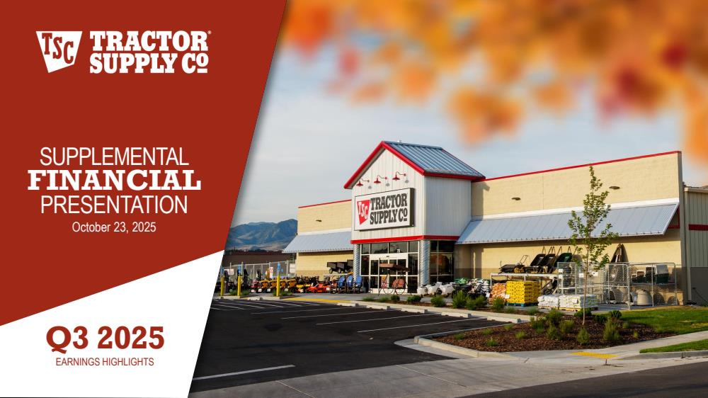 Tractor Supply Company operates as a rural lifestyle retailer in the United States. The company offers a selection of merchandise, including equine, livestock, pet, and small animal products necessary for their health, care, growth, and containment; hardware, truck, towing, and tool products; seasonal products, such as heating products, lawn and garden items, power equipment, gifts, and toys; work/recreational clothing and footwear; and maintenance products for agricultural and rural use. It provides its products under the 4health, Producer's Pride, American Farmworks, Red Shed, Bit & Bridle, Redstone, Blue Mountain, Retriever, C.E. Schmidt, Ridgecut, Countyline, Royal Wing, Dumor, Strive, Groundwork, Traveller, Huskee, Treeline, JobSmart, TSC Tractor Supply Co, Paws & Claws, and Untamed brands. As of June 25, 2022, it operated 2,016 Tractor Supply stores in 49 states; and 178 Petsense stores in 23 states. The company operates its retail stores under the Tractor Supply Company, Del's Feed & Farm Supply, and Petsense names; and operates websites under the TractorSupply.com and Petsense.com names. It sells its products to recreational farmers, ranchers, and others. The company was founded in 1938 and is based in Brentwood, Tennessee.